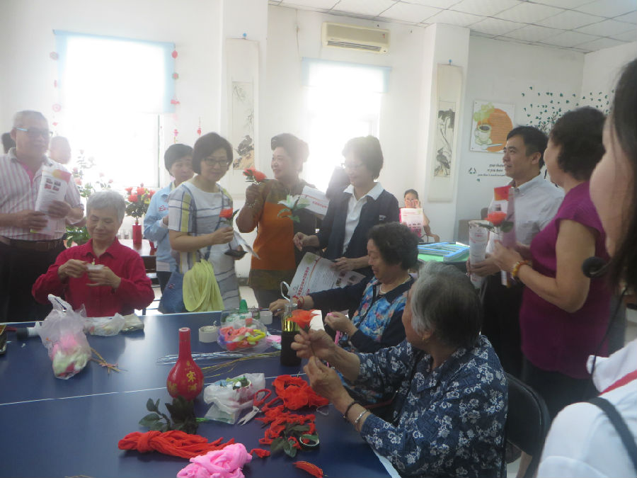 参访团在社区书记姚丽华的带领下,参观了省委五区寻找社区最美系列文化长廊及居民活动室,看到活动室内居民们正在制作绢花,参访团成员称赞她们心灵手巧,居民也高兴的将做好的绢花赠予他们。